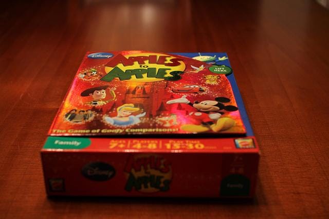 Apples to Apples is a party game originally published by Out of the Box Publishing, and now published by Mattel. The object of the game is to win the most rounds by playing a "red apple" card from one's hand to best "match" that round's communal "green apple" card as chosen by that round's judging player. The game is designed for four to ten ...more on Wikipedia